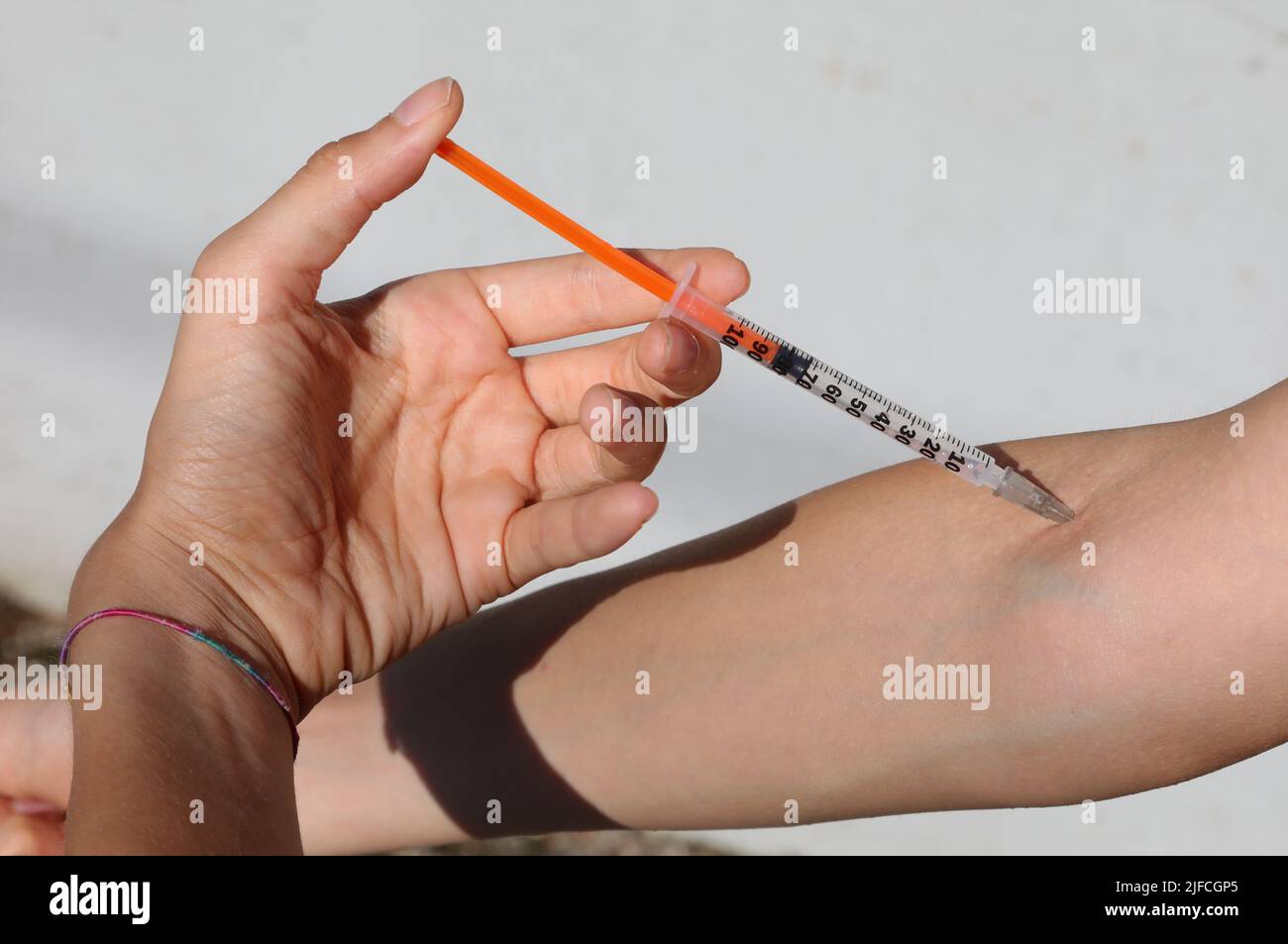 Young Girl Injecting Drugs Into Bare Arm With Hypodermic Stock Photo Alamy